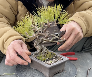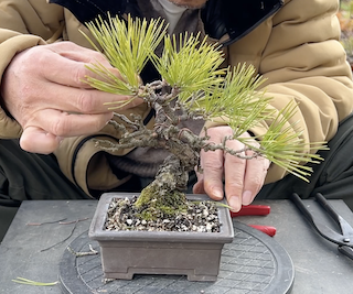 全体的に左に枝が流れるように樹形を整えていきます。銅線を巻き、枝全体を左にそして下向きに枝を整えていきます。