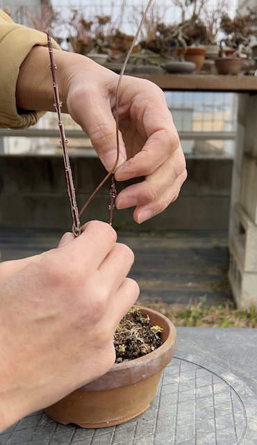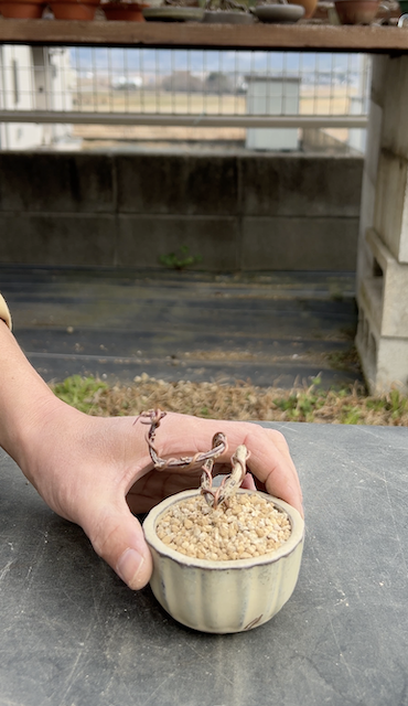 この真弓素材は「根上り」にしたいと思ったので、駄温鉢を使用。