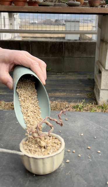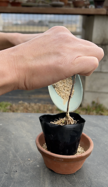 小粒の赤玉土:桐生砂=7:3の用土で植えます。